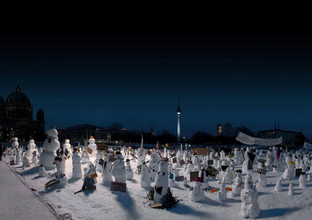 Poprosila obyvateľov Berlína, aby jej pomohli postaviť stovky snehuliakov, ktorí vyzerali ako protestujúci dav – dokonca rovno pred budovou nemeckého parlamentu. Kampaň pripravila agentúra DDB Berlin.
