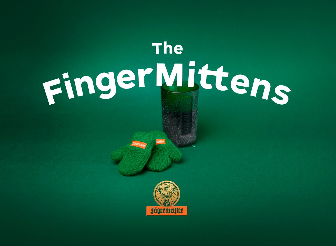 Toto sú Finger Mittens. Malé pletené „rukavičky“ na prsty, ktoré spríjemňujú držanie ľadovo vychladených shotov od Jägermeister. Značka tak s humorom pripomína ich “must have”, že pravý zážitok prichádza len vtedy, keď sa podáva ľadovo vychladený.