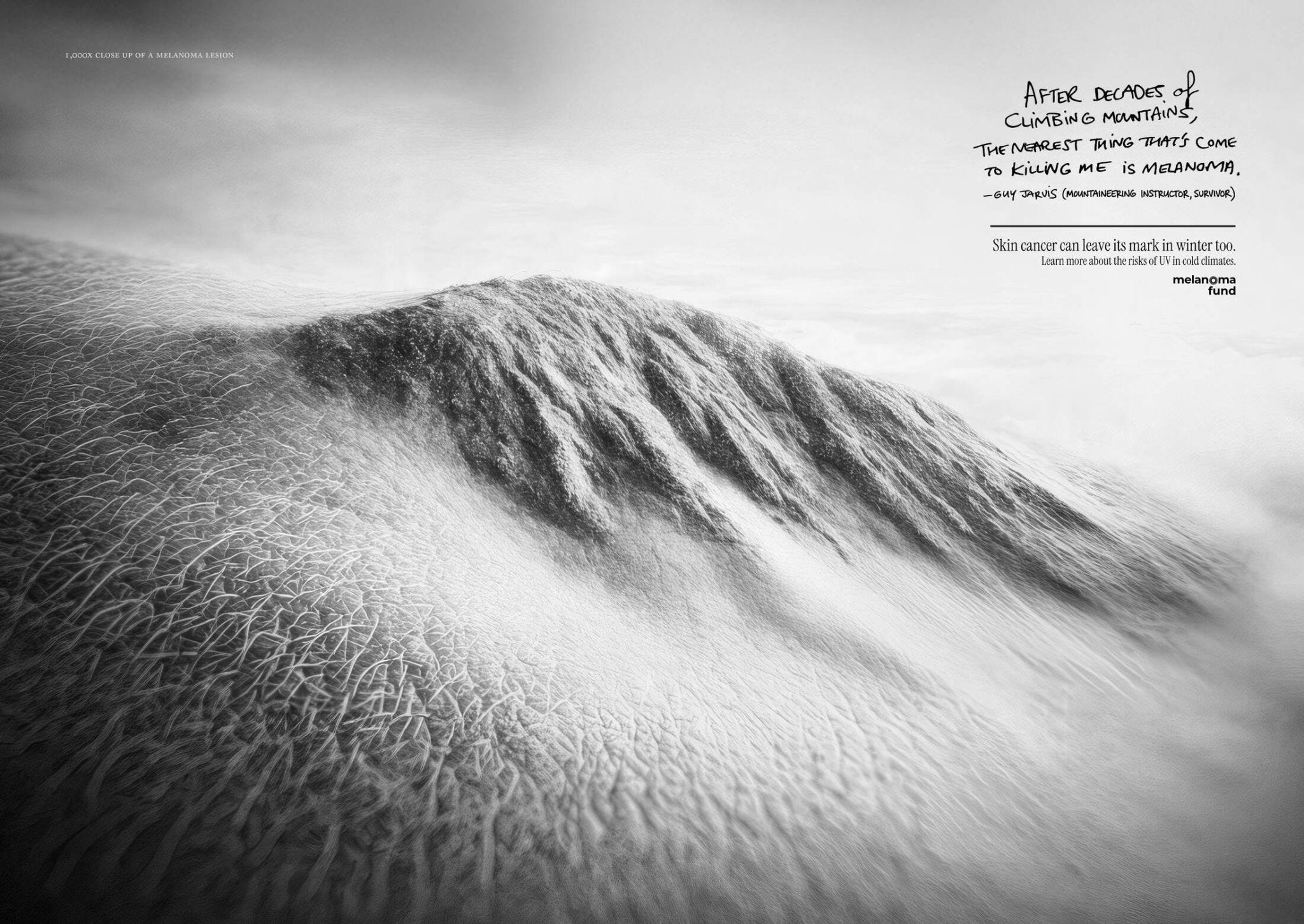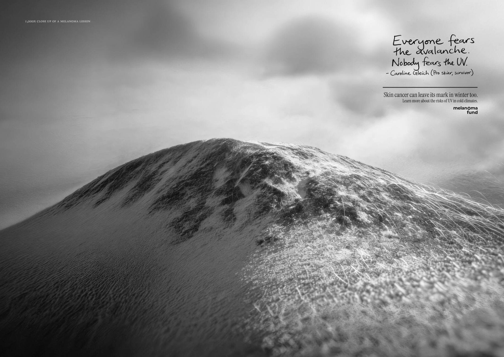 Práca s názvom „Peak Exposure“ neziskovky Melanoma Fund využíva makrozábery skutočných melanómov, ktoré pripomínajú zasneženú horskú krajinu. Upozorňujú tak na nebezpečenstvo rakoviny kože, ktoré je reálne aj v zimných mesiacoch. Pripravili v agentúre Klick Health.