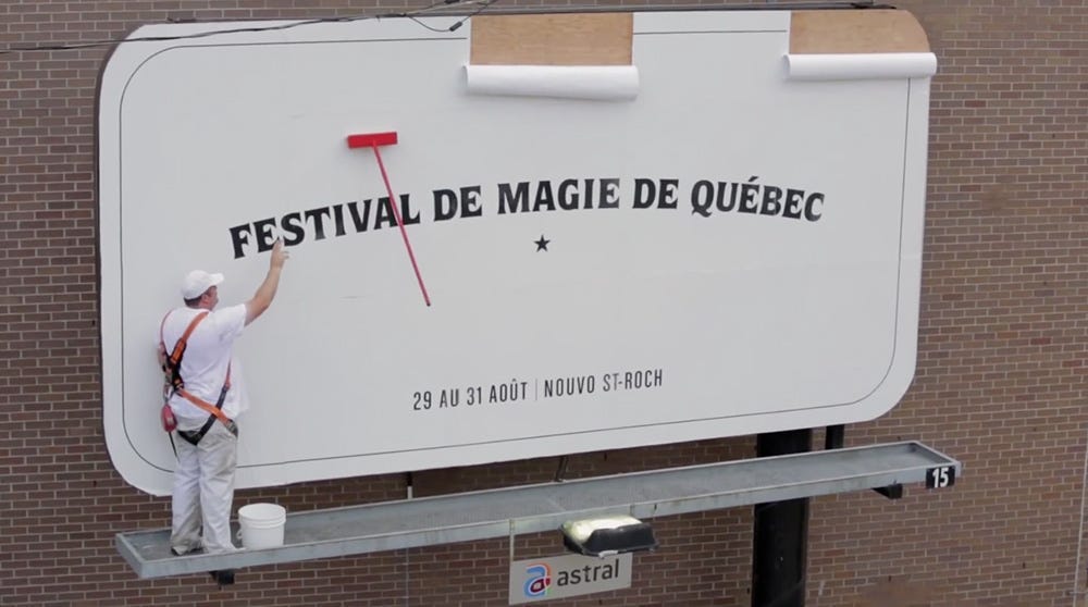 Každoročný festival mágie v kanadskom Quebecu je známy nielen svojím programom, ale aj tým ako o sebe dáva pravidelne vedieť. Pred pár rokmi sa bol tento trik tým, čo upútalo v uliciach. V roku 2014 tento kúsok pripravila agentúra LG2.