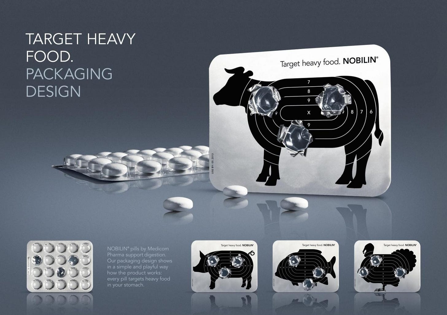 Obal pre Nobilin, tabletky na podporu trávenia, s ktorými doslova “zamierite a trafíte” ťažké jedlá.
